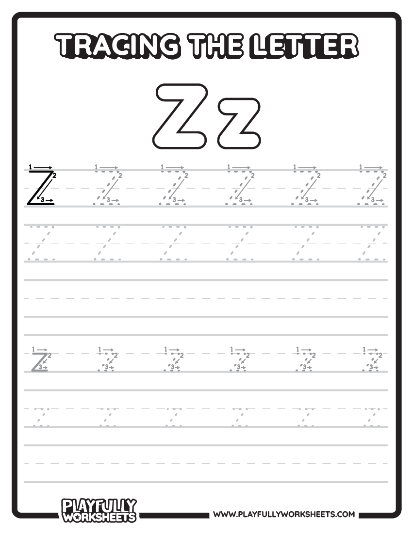 Zip through the alphabet with Letter Z on our final alphabet tracing pages! These trace letters sheets provide the perfect conclusion to the letter tracing journey. Consequently, consistent practice with all traceable alphabet letters will prepare your child for independent writing.